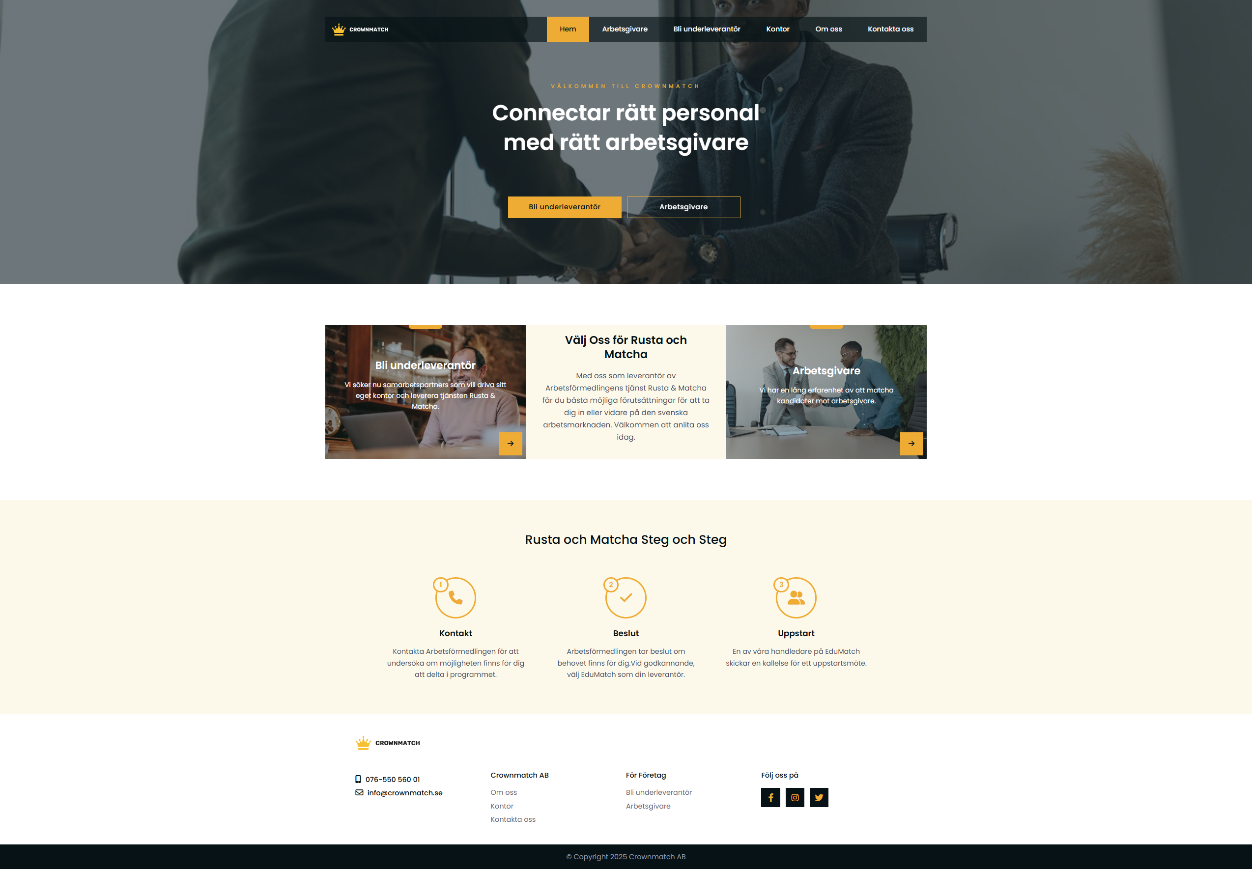 Vi har utvecklat en helt ny webbplats för CrownMatch, leverantör av Arbetsförmedlingens tjänst Rusta & Matcha. Projektet innefattade en fullständig rebranding, inklusive ny logotyp, uppdaterad grafisk profil, ett modernt och användarvänligt gränssnitt samt optimering av Google Business Profile och andra digitala kanaler för att stärka närvaron online.